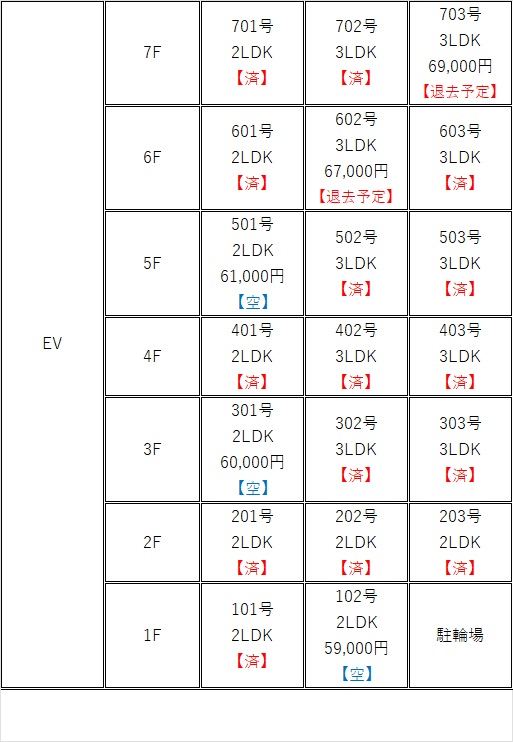 | 空室情報 | 102号(2LDK) 301号(2LDK) 501号(2LDK) 602号(3LDK)春 退去予定 703号(3LDK)3月末 退去予定 |