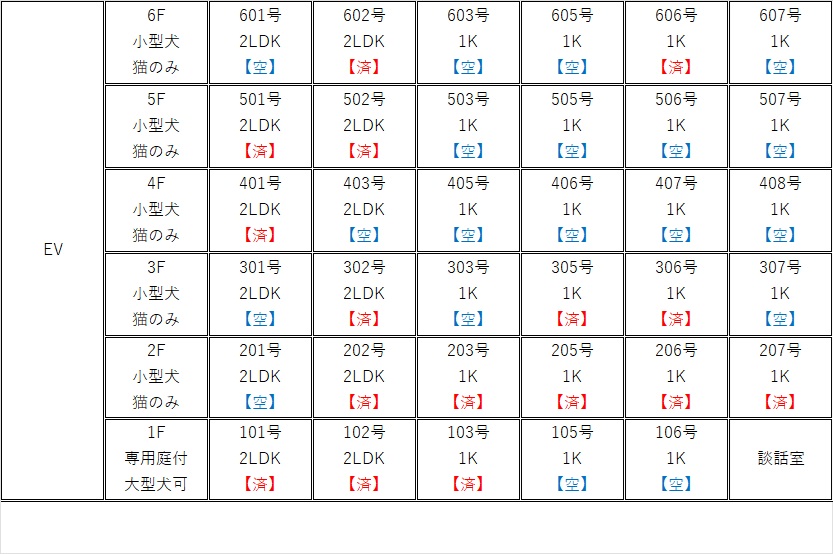 | 空室情報 | 105号(1K/専用庭付/大型犬可) 106号(1K/専用庭付/大型犬可) 201号(2LDK/小型犬/猫のみ可) 301号(2LDK/小型犬/猫のみ可) 303号(1K/小型犬/猫のみ可) 307号(1K/小型犬/猫のみ可) 403号(2LDK/小型犬/猫のみ可) 405号(1K/小型犬/猫のみ可) 406号(1K/小型犬/猫のみ可) 407号(1K/小型犬/猫のみ可) 408号(1K/小型犬/猫のみ可) 503号(1K/小型犬/猫のみ可) 505号(1K/小型犬/猫のみ可) 506号(1K/小型犬/猫のみ可) 507号(1K/小型犬/猫のみ可) 601号(2LDK/小型犬/猫のみ可) 603号(1K/小型犬/猫のみ可) 605号(1K/小型犬/猫のみ可) 607号(1K/小型犬/猫のみ可) |