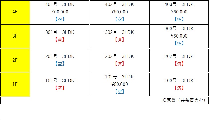 | 空室情報 | 102号(3LDK) 201号(3LDK) 303号(3LDK) 401号(3LDK) 402号(3LDK) 403号(3LDK) |
