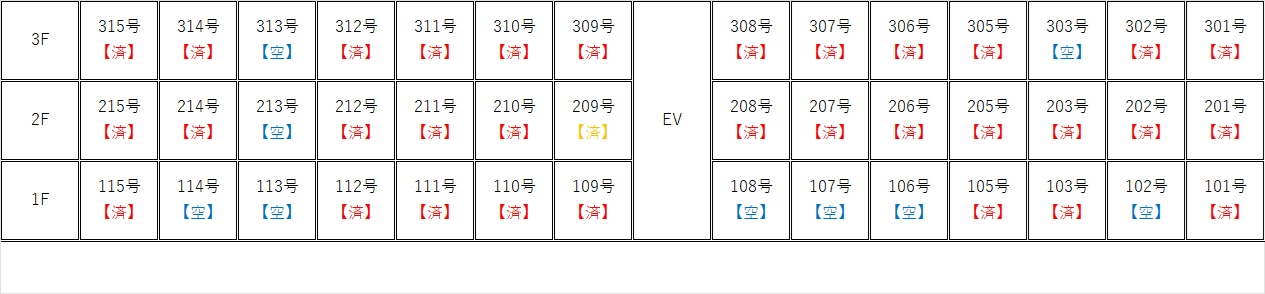| 空室情報 | 102号室(1K) 106号室(1K) 107号室(1K) 108号室(1K) 113号室(1K) 114号室(1K) 213号室(1K) 303号室(1K) 313号室(1K) |